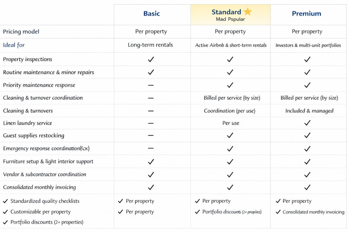 Every property is unique. All Service Plans can be customized based on property type, size, number of units, and hosting activity.